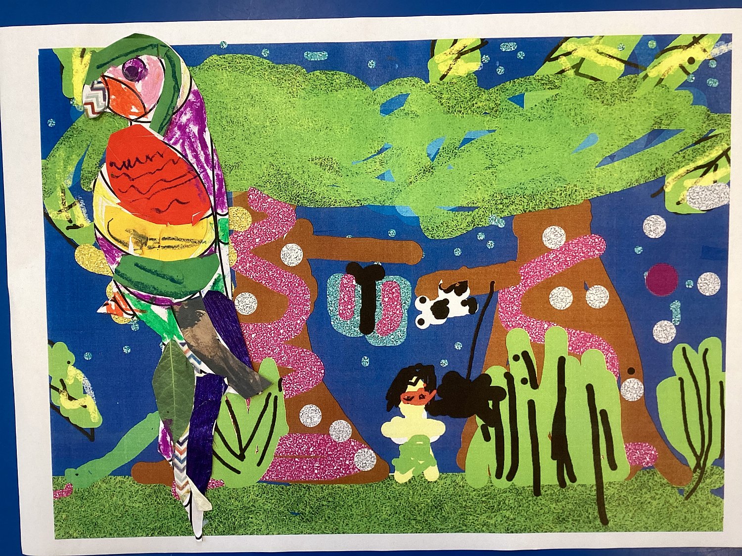 Flora Winters age 7 Trythall school, Cornwall Uk, parrot in the Amazon, ipad drawn background and collage parrot