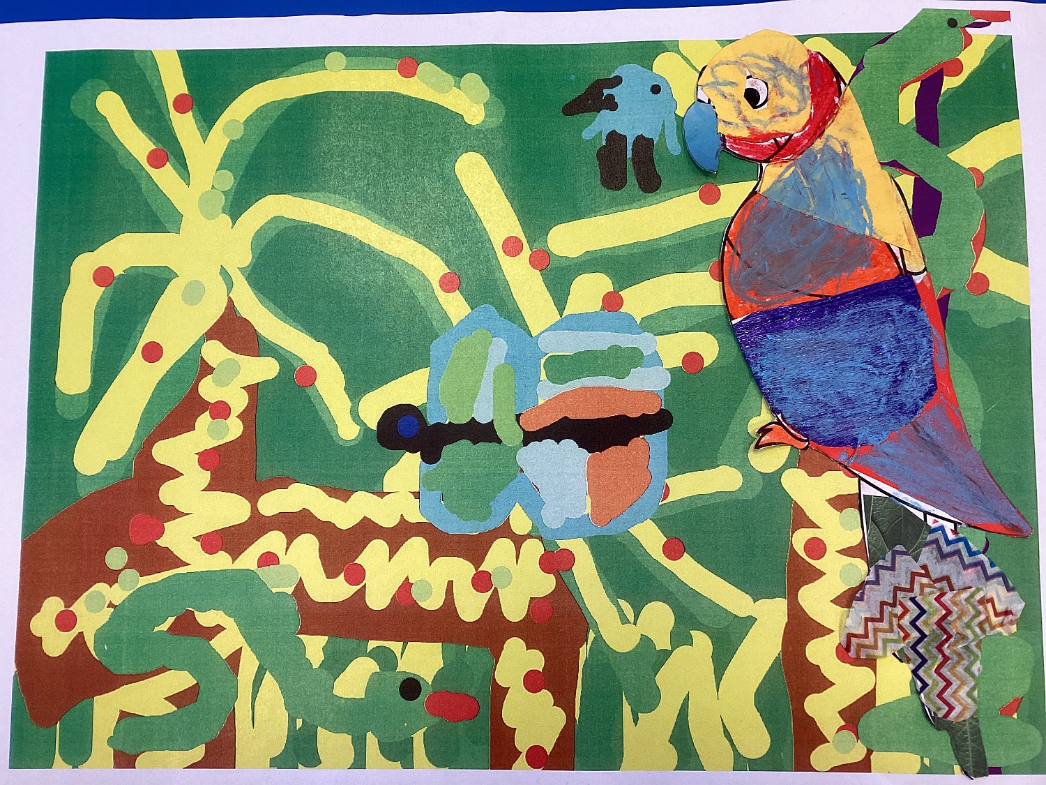 Rory Lanyon, age 6 Trythall school, Cornwall, Parrot of the Amazon, ipad drawn background and collage pRROT.