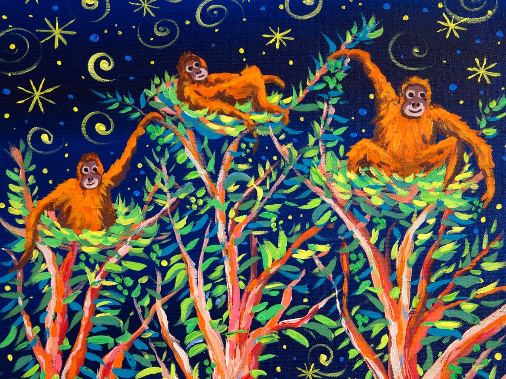 Stargazers. 12x12 inches Acrylic on canvas. BorneoBorneo Sunset. 12x12 inches Acrylic on canvas. BorneoMother and Child. 12x12 inches Acrylic on canvas. BorneoPerson of the Forest. 12x12 inches Acrylic on canvas. BorneoTwilight Orangutans. 24x24 inches Acrylic on canvas. Borneo12x12 inches Acrylic on canvas. Borneo Procreate iPad Digital Art