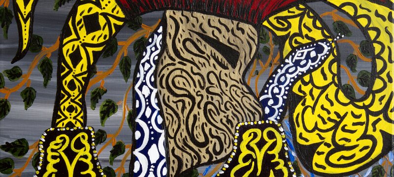 The Sky Snake Ashuinka and Ground Snake Runua - Painting by Nixiwaka Yawanawá. 24 x 24 inches acrylic on canvas