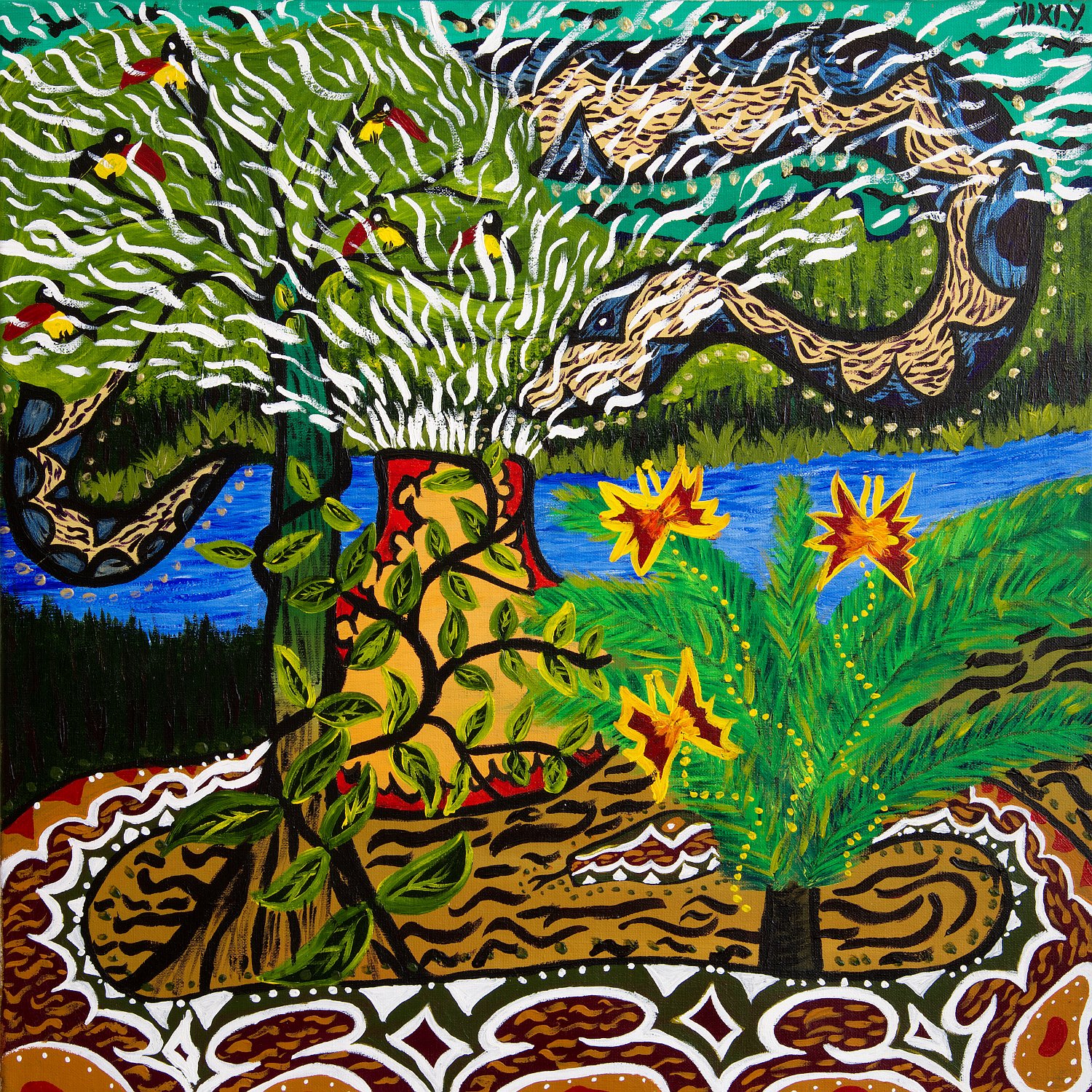 Yuxi Yuve - The Water Spirit of the Amazon Rainforest. 100 cm x 100 cm acrylic on canvas