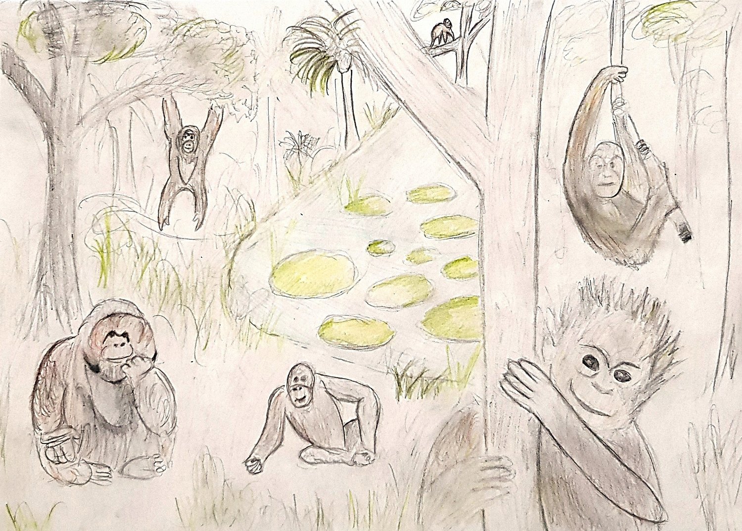 Year 4 class project, Farfield Bradford SchoolTobi Josey, Orangutans in their nests at dusk, A3 watercolour, Wiltshire, UKPhoebe Assheton-Smith, age 9, Walking in the Forest, A4 paperKaram Singh Dhillon, Age 12, Orangutans, A4 Sketch, with pops of colour, UKMorgelyn-Stocker-age-12-felt-tip-pen-on-A5Ayaan-Khan-10-Borneo-Orangutans-A4-paint-on-paper-Southwold-Primary-School-London-UK Age 6 to 8Age 13 and above including arty parents
